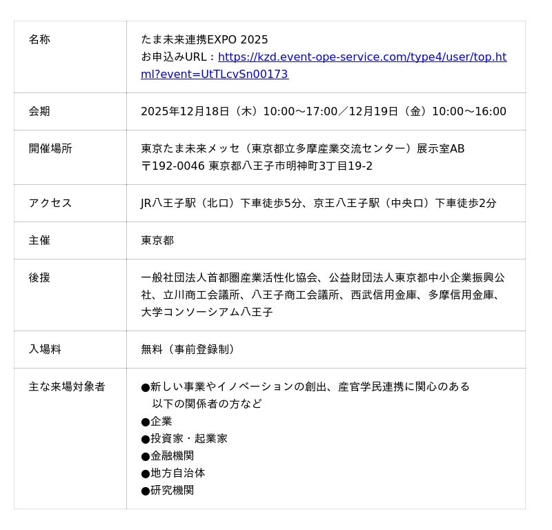東京都は、多摩及び近隣地域の学術機関を中心に、産業界、行政が連携した産業振興及び広域的な産業交流を目的とする展示会「たま未来連携EXPO 2025」を、東京たま未来メッセ(東京都立多摩産業交流センター)にて2025年12月18日(木)、19日(金)の2日間開催いたします。
