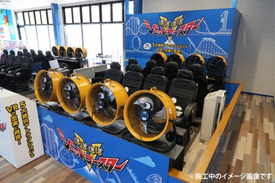 また、ゲームコーナーに隣接したVRアトラクション「ほぼほぼジェットコースターV(ブイ)」は、3月14日(金)同時オープンで、富士急ハイランドとダイナモアミューズメントが開発・運営しています。富士急ハイランドのアトラクション5大コースターである「FUJIYAMA」「ZOKKON」「高飛車」など過去にあったジェットコースターを含む5機種を、実写映像の「VR+MX4D」で再現し、その迫力を体験することができる絶叫ライドアトラクションです。VRアトラクションのため、ジェットコースターの熱狂的なファンの方はもちろん、初めてという方も、天候に影響されることなく“仮想現実”でライドを体験できます。