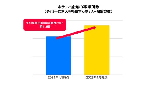 そうした中、関西エリア(※6)におけるタイミーに掲載されたホテル・旅館の2025年1月の募集人数は、前年同月比約1.3倍となりました。ホテル開業前から計画を立ててスキマバイトを活用する例や、スキマバイトのワーカーを中心に運用ができるようになった業務が出てきている例など、それぞれのホテル・旅館の状況に合わせたスキマバイトの活用事例が生まれています。