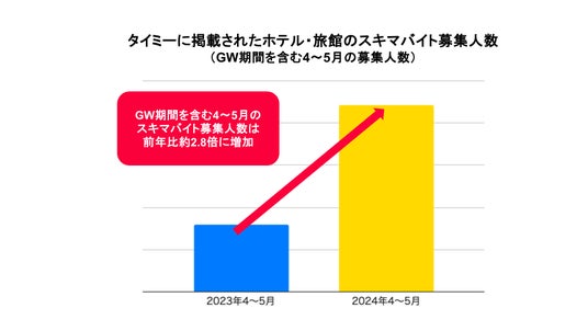 ホテル・旅館業界の繁忙期の一つであるGW(ゴールデンウィーク)にも活用が広がっています。2023年と2024年のタイミーの募集人数を比較(GW期間を含む4~5月時点で比較)すると約2.8倍に増加しており、集中して人材確保が必要となる繁忙期対策の一つとして、スキマバイトのさらなる活用がホテル・旅館業界内に広がりを見せています。
