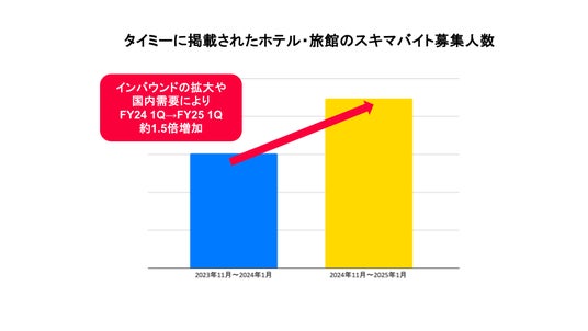 これらの動向が影響し、ホテル・旅館の事業所数(タイミーに求人を掲載するホテル・旅館の数)は、2025年1月時点での前年同月比約1.3倍となりました。また、タイミーに掲載された募集人数は約1.5倍増(FY24 1Q期間とFY25 1Q期間の比較)(※4)で、夏季繁忙期の影響を受け、2024年8月には過去最高人数も更新。引き続き、スキマバイトの活用が拡大しています。
