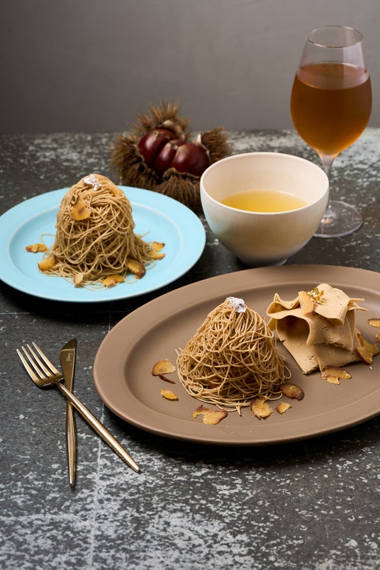 それぞれ2つの産地の栗を使ったモンブランを1皿で提供。細さ1ミリの錦糸状に絞ったモンブランと、厚さ1ミリの帯状に絞ったモンブランに分けることで、舌触りの違いによる風味の差を楽しんでいただけます。