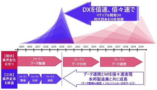 近年、製造業においてはデジタルトランスフォーメーション(DX)が求められる一方で、化学品材料の研究開発においては、情報の機密性の高さから企業間や部署間のデータ連携のハードルが極めて高く、それを起因とする開発プロセスの冗長化がしばしば発生しています。本プロジェクトでは、三社がそれぞれの強みを活かし、データを秘匿したまま連携、そしてそれを基盤とするMIの実装を加速することで、従来にない革新的な開発プロセスを実現し、開発コストやリードタイムの大幅な削減を目指します。