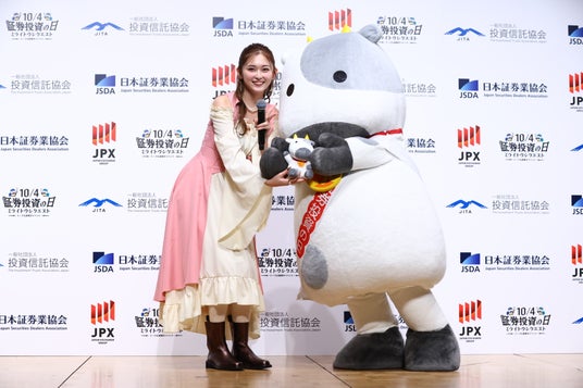 若年層の代表として登壇したのは、モデル・タレントのゆうちゃみさん。イベントタイトル「ミライトウシクエスト」にちなんで冒険者風の衣装をまとい、会場の雰囲気を演出いただきました。ステージには、より多くの人に「証券投資」を身近に感じていただきたい、という願いから生まれた、証券業界のマスコットキャラクター「とうしくん」もサプライズ登場。愛らしい動きで観客の大学生を魅了しました。また、ゆうちゃみさんへオリジナルぬいぐるみをプレゼントすると、会場は温かな拍手と笑顔に包まれました。