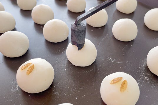 そのお米を、熟練の職人が丁寧に蒸し上げ、杵と臼でしっかりとついて、つややかに成形。ひと粒ひと粒が、艶やかに輝く、美しい団子に仕上がります。