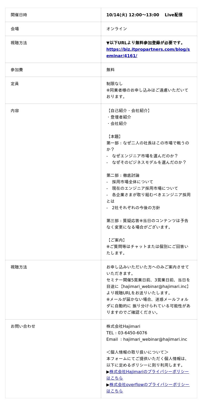 株式会社Hajimari(所在地:東京都渋谷区、代表取締役:木村 直人、以下 当社)は、ITエンジニアの採用に課題を抱える企業の経営層・人事部門向けウェビナー「事業成長を加速させるために企業が取るべきエンジニア採用戦略とは【ITプロパートナーズ VS Offers】」を、2025年10月14日(火)にライブ配信することをお知らせいたします。