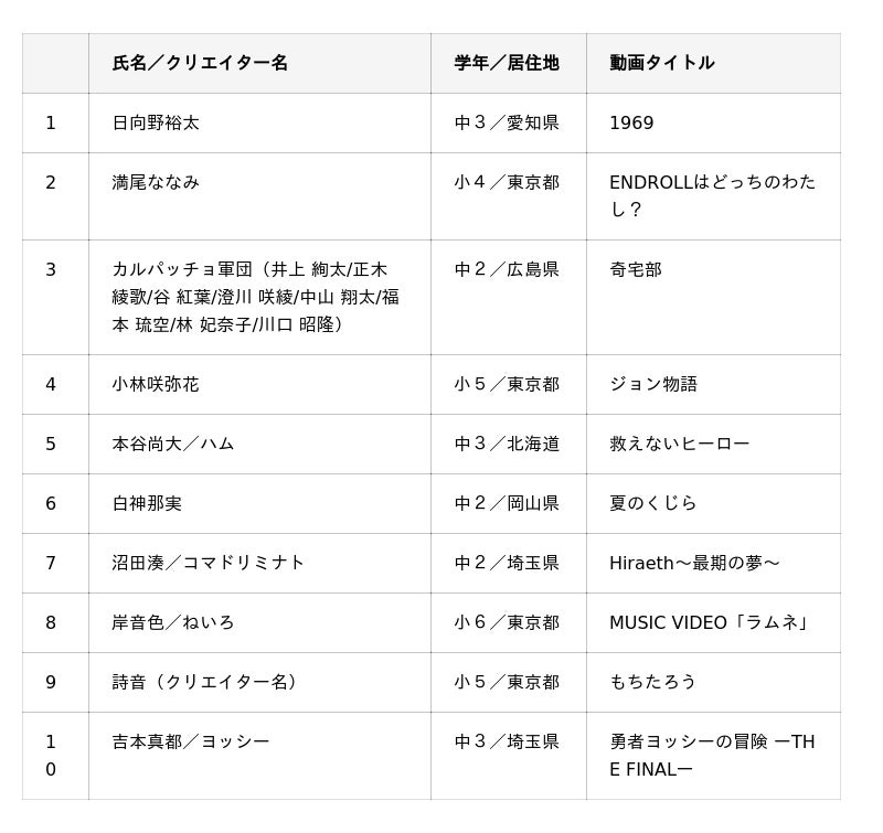 【全国小中学生動画コンテスト】ファイナリスト決定!11/15(土)最終審査会に全国トップの才能が集結!