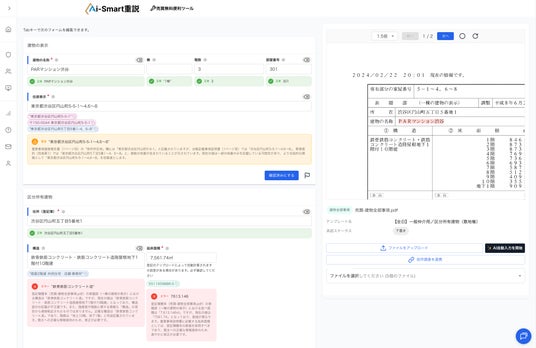アップロードした書類から内容を自動出力。抽出後の一次チェックもAIが実施します。