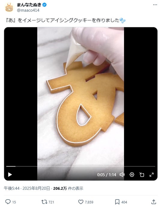 ひらがな46文字をアイシングクッキーで表現したあいうえお絵本。予約開始時に投稿された「あ」の制作動画のインプレッション数は200万超の大反響。一部書店では本書収録の実物クッキーを展示予定。