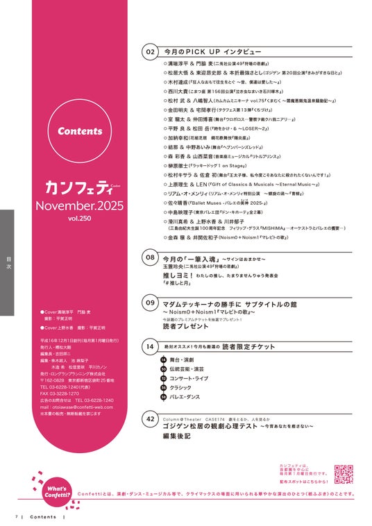 「エンタテインメントを、もっと身近なものに。」を理念とするロングランプランニング株式会社(東京都新宿区、代表:榑松大剛)は、シアター情報誌「カンフェティ」11月号 vol.250 を2025年10月6日(月)に発行いたします。配布場所は、首都圏を中心とした劇場・ショップ・駅など合計1,500箇所以上に設置されます。