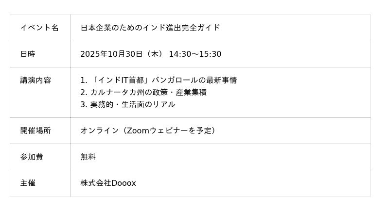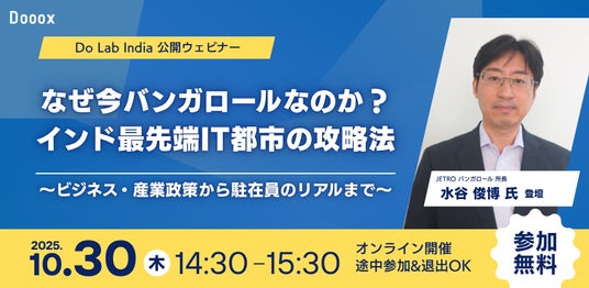“行動で世の中を変えていく“を理念に掲げる株式会社Dooox(東京都品川区、代表取締役 久保寺亮介/以下「当社」)が運営するインド進出支援プラットフォーム「Do Lab India」は、この度、日本企業のためのウェビナー「なぜ今バンガロールなのか?インド最先端IT都市の攻略法 ~ビジネス・産業政策から駐在員のリアルまで~」を2025年10月30日(木)にオンラインで開催いたします。