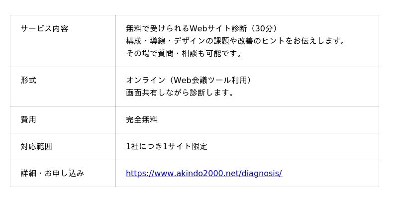 こうした課題を抱える企業に向けて、弊社は気軽に利用できる「Webサイト無料診断サービス」を開始しました。プロの視点で短時間に課題を抽出し、改善への第一歩を後押しします。