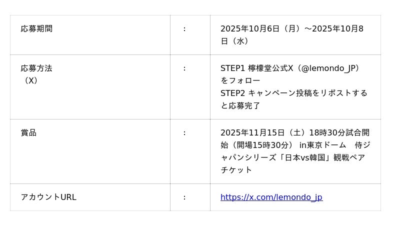 10月6日(月)より3日間、「侍ジャパンシリーズ観戦ペアチケットが当たる!Xフォロー&リポストキャンペーン」を実施します。期間中、「檸檬堂」公式Xアカウントをフォロー&キャンペーン投稿をリポストしていただいた方の中から抽選で10組20名様に、2025年11月15日(土)開催の侍ジャパンシリーズ「日本vs韓国」観戦ペアチケットをプレゼントします。「檸檬堂」を片手に、試合で活躍する侍ジャパンと一丸となって応援できる機会ですので、是非ご応募ください。