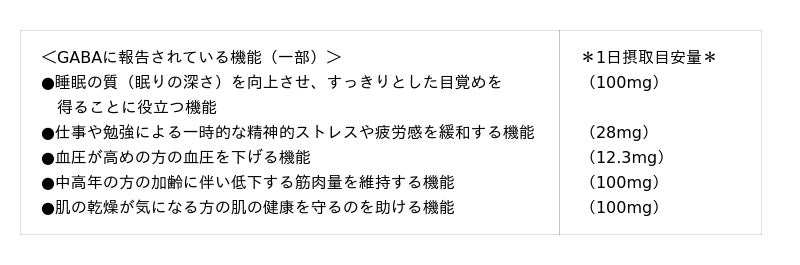 GABAはγ-アミノ酪酸と呼ばれるアミノ酸の1種で、以下に示されるような数々の機能が報告されています。