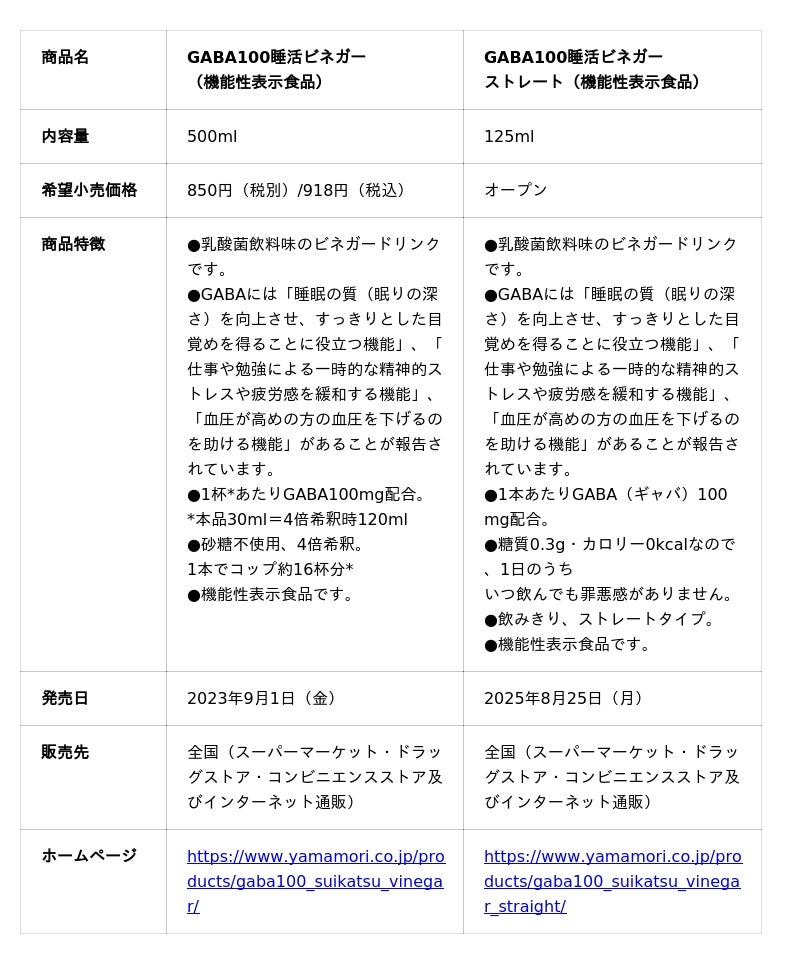 ヤマモリ株式会社が2023年9月に発売した乳酸菌飲料味のビネガードリンク。自社の醸造技術を用いて製造したGABA(ギャバ)を1杯(※2.)あたり100mg配合した機能性表示食品です。GABAには、睡眠の質(眠りの深さ)を向上させ、すっきりとした目覚めを得ることに役立つ機能など複数の機能が報告されています。