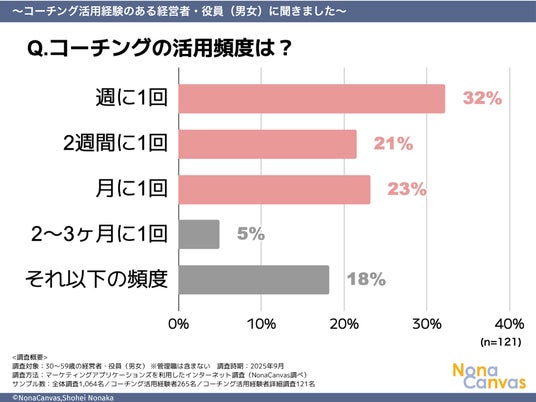 週1回が最多(32%)という結果は、コーチングが経営における継続的な対話パートナーとして位置づけられていることを示しています。また、隔週(21%)、月1回(23%)という頻度も一定数存在することから、経営者の状況や課題に応じて柔軟に頻度を調整していることがわかります。