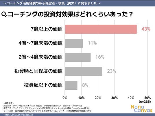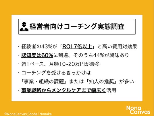 「今回の調査で、経験者の43%が『投資対効果7倍以上』と回答した結果は、私自身の経験とも一致します。私は2020年1月からコーチングを受け続けており、その過程で上場企業の執行役員として赤字事業を5年で10倍成長させることができました。