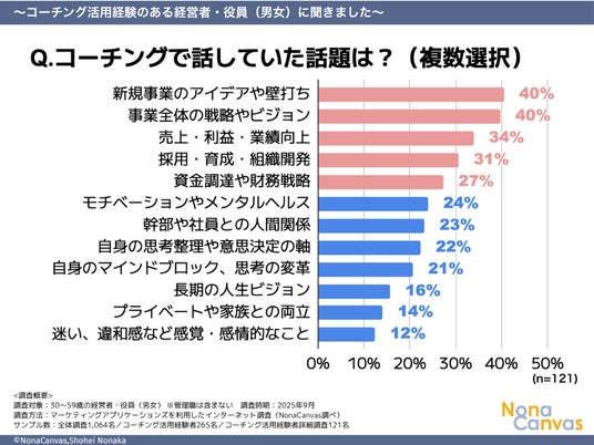 経営者向けコーチング事業を展開する株式会社NonaCanvas(本社:東京都千代田区、代表取締役:野中祥平)は、30~59歳の経営者・役員を対象に「経営者向けコーチング実態調査2025」を実施しました。