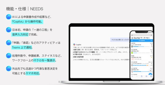 ※「申請書ひな形選定、申請書作成、申請(起票)」までの申請の全ての工程がCopilot 対応による音声入力が可能であるワークフロー(当社調べ)