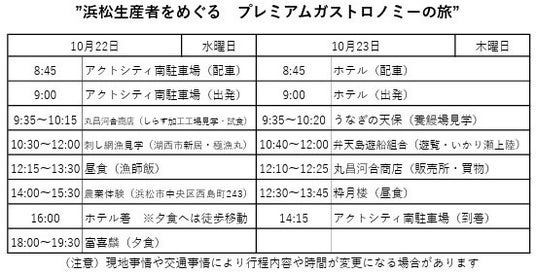 イベント名称 : 【浜松生産者をめぐるプレミアムガストロノミーの旅】報道関係者用無償ツアー開催期間 :2025年10月22日(水)から10月23日(木)9時頃発、翌日14時頃浜松駅着