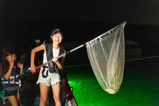 エビスキ漁は浜名湖が汽水湖であるため、湖 という名前を冠していますが、海と繋がっています。そのため、潮の 満ち引きが存在し、潮にのって流れてくるエビやカニ、イカや魚を捕 る漁法です。多い時には天然の車エビが200匹ほどすくえることもあります。小学生でも網ですくうだけなので、簡単にとることがで きます。 ※今回のモデルツアーは刺し網になります。
