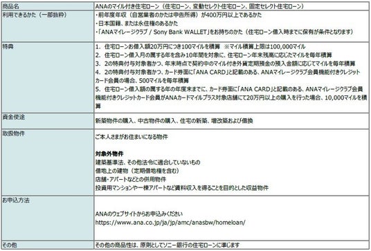ANAグループとソニー銀行との連携商品としては、ANA Xがソニー銀行を所属銀行とする銀行代理業者として2019年に取扱を開始した「ANAマイレージクラブ / Sony Bank WALLET(Visaデビット付きキャッシュカード)」、「ANAマイル付き外貨定期預金」に続く新商品となります。なお、ANA Xは「ANAのマイル付き住宅ローン」リリースに伴い、あらたに銀行代理業務として住宅ローンの媒介業務を開始します。