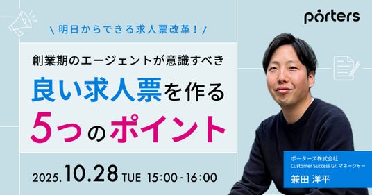 人材ビジネス向けマッチングシステムを提供するポーターズ株式会社(東京証券取引所グロース. 証券コード5126、東京都港区、代表 西森 康二)は、「創業期のエージェントが意識すべき、求人票作成5つのポイント」と題した無料セミナーを2025年10月28日(火)15:00~オンラインで開催いたします。