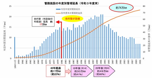 現在、全国の水道管の総延長は約74万km、多くは昭和30~40年代の高度経済成長期に整備されたもので、法定耐用年数40年を経過した管路の延長は約17.6万km(総延長の約23.6%)、さらに2040年には約49万km(約66%)と今後急増していくと言われています。水道管の老朽化により日本全国で年間2万件を超える漏水・破損事故が発生し、濁水や断水、健康被害、災害時の被害拡大など、さまざまなリスクをもたらしています。しかし、更新率は年間わずか約0.64%と低く、すべての水道管を更新するには130年以上かかる想定となっています。