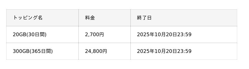 このたびのトッピング拡充に伴い、「いつものトッピング」として提供中の「20GB(30日間)」および「300GB(365日間)」については、2025年10月20日をもって販売を終了します。
