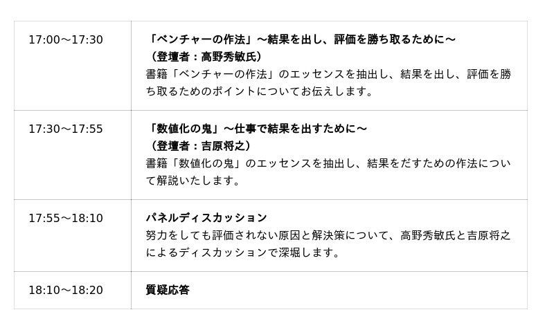 当日は学びを深めるパネルディスカッションと、質疑応答もございます。また、ご参加者特典として結果を出し、評価を勝ち取るビジネスパーソン必読の書「ベンチャーの作法」ブックガイドを進呈します。