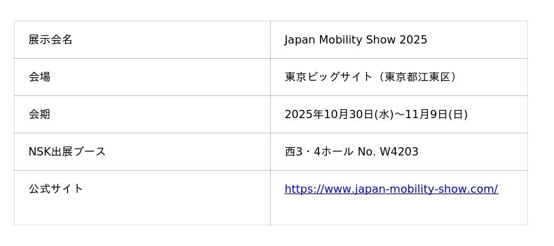 日本精工株式会社(本社:東京都品川区、代表者:取締役 代表執行役社長・CEO 市井 明俊、以下NSK)は、2025年10月30日(木)~11月9日(日)に東京ビッグサイトで開催される「Japan Mobility Show 2025」(主催:一般社団法人 日本自動車工業会)に出展します。