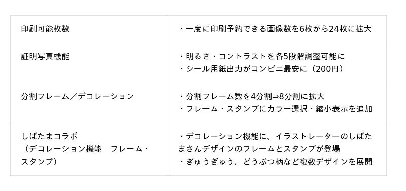 このたび、お客さまから寄せられた「写真を手軽にデザインしたい」「証明写真を安く印刷したい」「フレームやスタンプの種類を増やしてほしい」といった声を反映し、利便性・機能性・楽しさの3つの観点でアップデートいたしました。