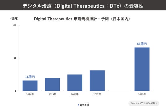 ●保険適用の治療用アプリなどDigital Therapeutics市場は、2024年に日本国内で16億円規模と推計、2030年には66億円規模へ成長