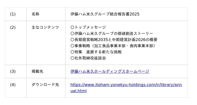 伊藤ハム米久ホールディングス株式会社(本社:東京都目黒区、代表取締役社長:浦田寛之)は、株主・投資家をはじめとするステークホルダーの皆様に、弊社グループの中長期にわたる価値創造のストーリー、財務・非財務情報のご理解をより深めていただくことを目的として、「伊藤ハム米久グループ統合報告書2025」を発行し、弊社ホームページにて公開しました。
