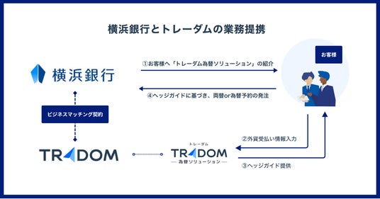 トレーダム株式会社(本社:東京都千代田区、代表取締役社長:浦島 伸一郎、代表取締役:阪根 信一、以下「当社」)は、横浜フィナンシャルグループの横浜銀行(本社:神奈川県横浜市西区、代表取締役頭取:片岡 達也、以下「横浜銀行」)と、横浜銀行の顧客である法人企業の為替リスク管理の支援に向けて、顧客紹介を目的としたビジネスマッチング契約を締結したことをお知らせいたします。