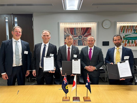 (調印式の様子:左からNH3 Chairman Charles Whitfield氏、NH3 CEO Stephen Hall氏、当社 常務執行役員 高橋和弘、西オーストラリア州首相 Roger Cook氏、Oceania 代表取締役 Nick Bentley氏)