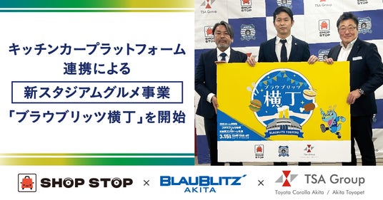 日本最大級のモビリティビジネスプラットフォーム「SHOP STOP」を展開する株式会社Mellow(本社:東京都港区、代表取締役社長:石澤正芳、以下「メロウ」)は、店舗型モビリティを活用し、地域コンテンツの創出を通じて街の活性化を図るトヨタカローラ秋田株式会社および秋田トヨペット株式会社(TSAグループ 代表取締役社長:伊藤哲充、以下「TSAグループ」)が運営するSHOP STOP秋田とブラウブリッツ秋田において、2025年シーズンから秋田県内のプロスポーツチームとして初めて、キッチンカープラットフォームと連携したスタジアムグルメ事業「ブラウブリッツ横丁」を開始することを3月7日の記者会見で発表いたしたことをお知らせいたします。