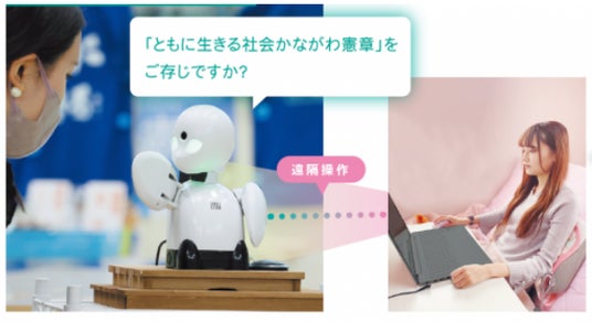 県では、令和元年度から、障がい者を在宅で勤務する県職員として任用し、分身ロボットOriHimeを活用して、障がい者の社会参加・就労の機会拡大を図ってきました。令和元年度から令和5年度は、ALS(筋萎縮性側索硬化症)患者の高野元氏を県共生社会アドバイザーとして任用し、共生社会実現のための諸施策に関する助言を頂きました。令和4年度からは、難病患者のみさきさんを県職員(会計年度任用職員)として任用し、「ともに生きる社会かながわ憲章」の説明や憲章グッズの配布など双方向のコミュニケーションをとりながら、憲章のPR業務等を行ってきました。(実施場所:令和4年度平塚市役所内福祉ショップ、令和5年度小田原市役所障がい福祉課窓口、令和6年度相模原市立あじさい会館内福祉ショップ)