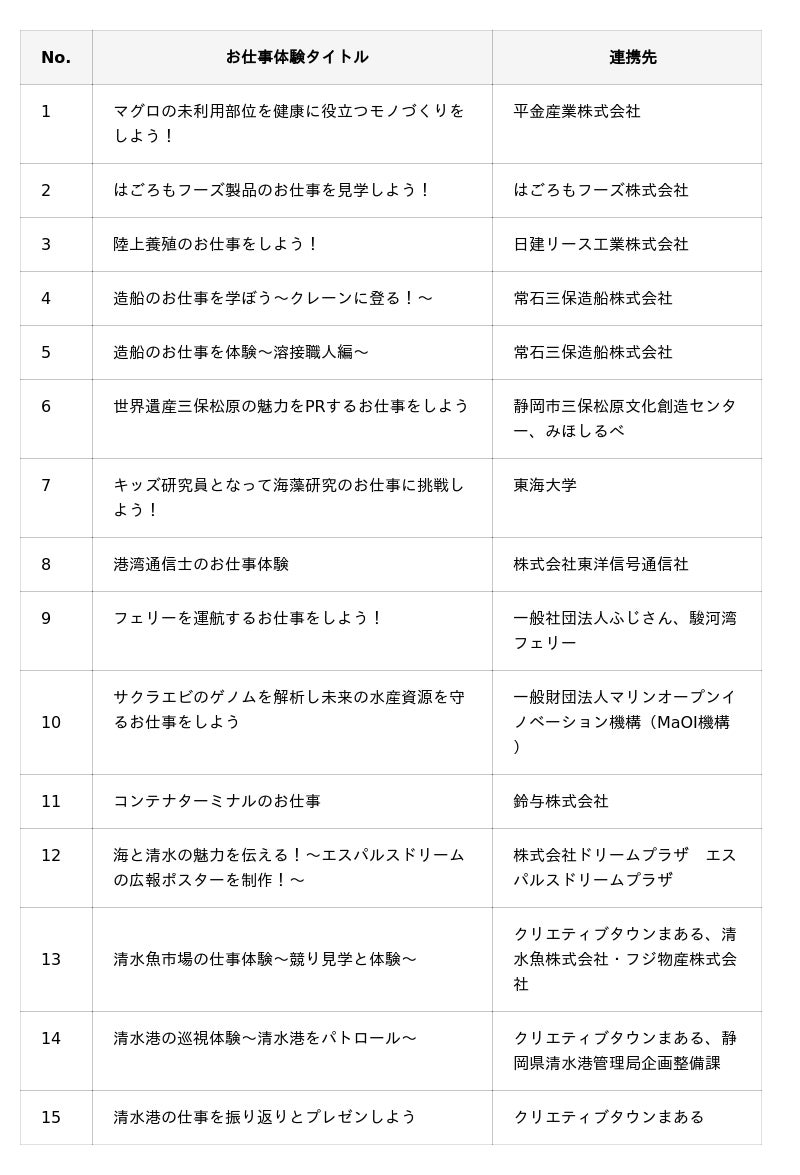 今年は、子どもたちの夏休みシーズンにあわせて7月25日(金)~8月23日(土)の期間を中心に開催。例年の人気プログラムに加え、新たに『港湾通信士』や『エスパルスドリームプラザの施設広報』、『港湾パトロール』のお仕事など、ここでしか体験することのできない新規プログラムも追加し、港湾都市として発展してきた清水を舞台に、過去最多となる全15種の様々なプログラムを展開しました。