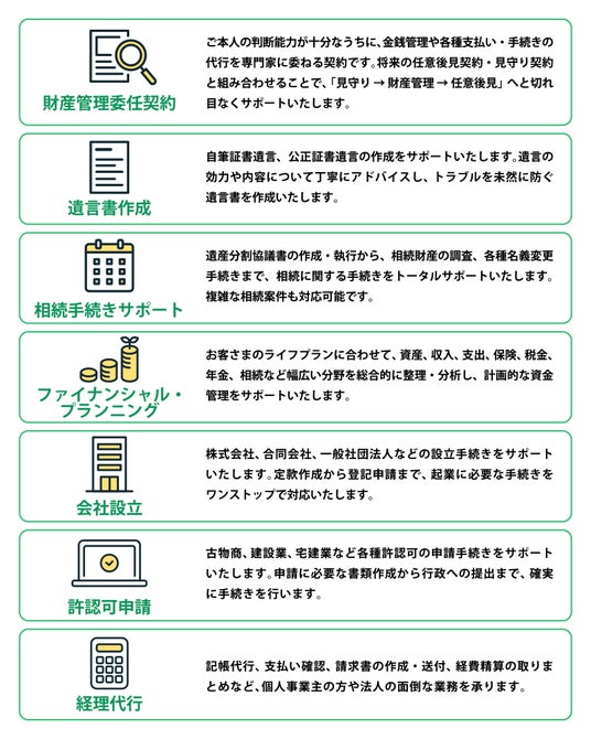 当社は「健全な資産形成を通じて豊かなライフスタイルの実現に貢献する」を経営理念に2023年に創業し、資産運用・管理をご支援するウェルスマネジメントサービスを提供してきました。このたび行政書士法人を設立することで、これまで外部の専門家と連携して対応してきた「財産管理委任契約」「相続手続き」「遺言書作成」を、グループ内で直接ご提供できる体制を整えました。