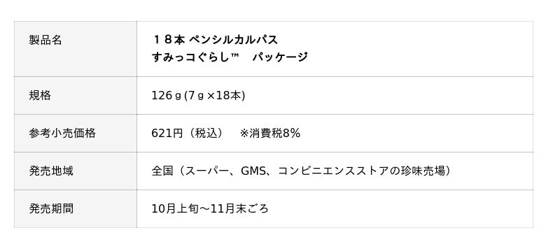 「18本ペンシルカルパス」と「すみっコぐらし(TM)」のコラボレーションにより、「おいしそう!」、「かわいい!」というワクワクした楽しい気持ちになっていただき、毎日のおやつ時間をより豊かな時間にしていただければと考えます。