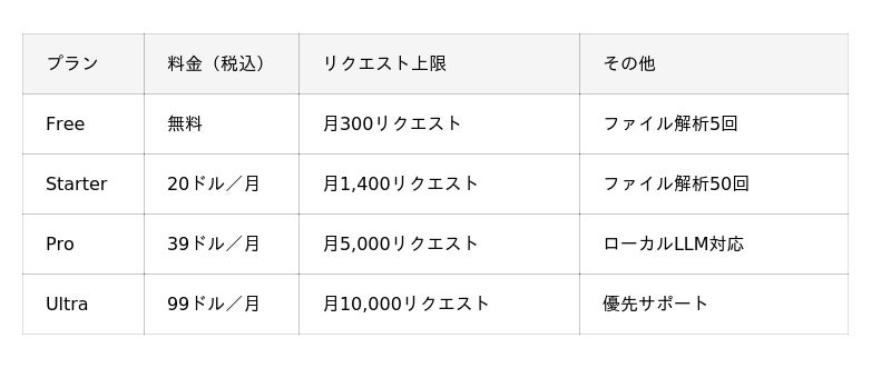 クラウド/ローカル両対応し、APIキーは不要。月額20ドル~提供中(Freeプランあり)。