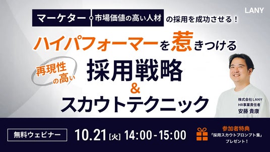 デジタルマーケティング支援を提供する株式会社LANY(東京都渋谷区、代表取締役社長:竹内渓太)は、【無料ウェビナー】マーケターや市場価値の高い人材の採用を成功させる! ハイパフォーマーを惹きつける再現性の高い採用戦略とスカウトテクニックを10/21(火)に開催いたします。