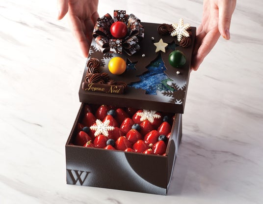蓋を開けると、一面に敷き詰められた真っ赤な苺が艶やかに煌めきます。苺の下には、ラムレーズンを散りばめたミルクチョコ レートムースと、フルーティな酸味と苦味、甘味のバランスが良いベトナム産カカオ豆を使用したガトーショコラを重ねました。そこにベリーのムースと苺のコンフィチュールを合わせ、やさしい酸味でアクセントを加えて仕上げています。苺やベリーの甘酸っぱさが、なめらかで濃厚なカカオのコクを引き立てる奥深い味わいのクリスマスケーキです。