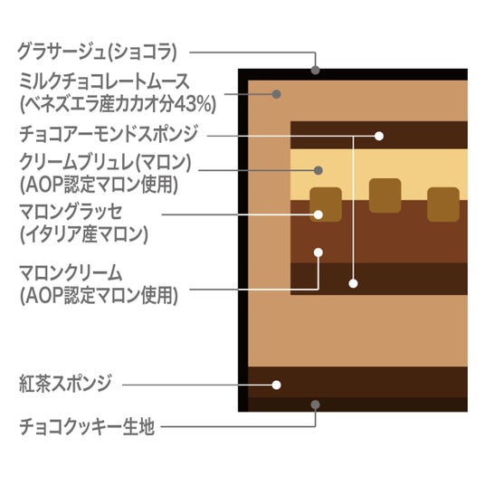 AOP(※)認定フランス産マロンから作ったマロンペーストを使用したクリームブリュレとマロンクリームをカカオ分43%のミルクチョコレートムースにとじ込めました。ミルクチョコレートムースには、ナッツやバニラ、キャラメルのようなアロマが特徴のベネズエラ産カカオを使用しており、豊かなマロンの味わいをいっそう引き立てます。