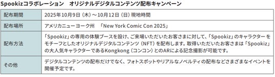 ソニー銀行株式会社(代表取締役社長:南 啓二/本社:東京都千代田区/以下 ソニー銀行)は、web3関連事業子会社であるBlockBloom株式会社(代表取締役社長:渡邉 尚史/本社:東京都千代田区/以下 BlockBloom)および、株式会社ソニー・ミュージックレーベルズ(代表取締役執行役員社長:辻野 学/本社:東京都千代田区/以下ソニー・ミュージックレーベルズ)のキャラクター・アニメーションコンテンツ「Spookiz(スプーキッズ)」とのコラボレーションにより、コミック、アニメ、ゲーム、映画など幅広いジャンルを扱うアメリカ最大級のポップカルチャーイベントである「New York Comic Con 2025」に、初出展することをお知らせします。