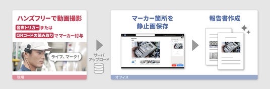 「ライブ、撮影」「ライブ、マーク」といった音声やQRコードの読み取りなどにより、作業を妨げることなく、ハンズフリーで必要なシーンにマーカー付与・静止画の撮影