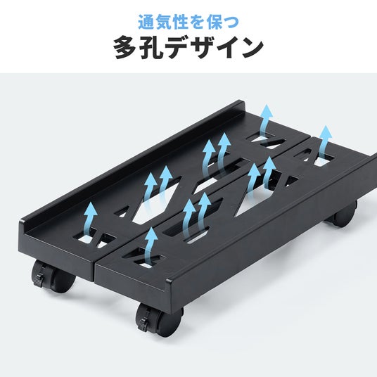 デスク下にパソコンを設置しても、出し入れや清掃がしづらい…そんな悩みを解決するのがこのPCスタンド。前輪にストッパーが付いているため、必要なときだけスムーズに引き出せて固定も簡単。床面から7cm浮かせる構造で、ホコリや熱のこもりも防ぎ、常に快適な作業環境を維持できます。