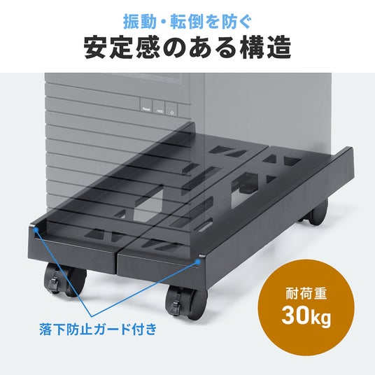 頑丈なスチール構造と耐荷重30kgの設計により、重量のあるハイスペックゲーミングPCも安定して支えます。両サイドには落下防止ガードを装備し、振動や衝撃による転倒をしっかり防止。