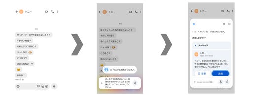<体験概要> ホーム画面のウィジェットにある「アプリ間のシームレスな操作」をタップすると、ディナーのお店探しに困っているトニーからお店の希望条件と助けて!とのメッセージがSMSに届きます。そこで、Google Geminiに希望条件と検索結果をトニーにメッセージするようAIに指示を出すとお店探しとメッセージ送信が一気に完了する体験をお楽しみいただけます。